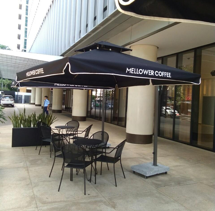 DÙ CHE QUÁN CAFE ĐẸP Dù cà phê dạng : Lệch tâm vuông Mẫu dù lệch tâm vuông với ưu điểm tán dù rộng, có phần rèm phủ tối ưu khả năng che mát tạo bóng râm tốt, đồng thời tán vuông 4 cạnh phù hợp với các vị trí như vĩa hè, góc tường mà không chiếm quá nhiều không gian Dù lệch tâm vuông linh hoạt trong việc phối hợp với nhiều dạng bàn ghế như bàn tròn,bàn vuông, 4-6-8 ghế hay kể cả bàn chữ nhật ghế …